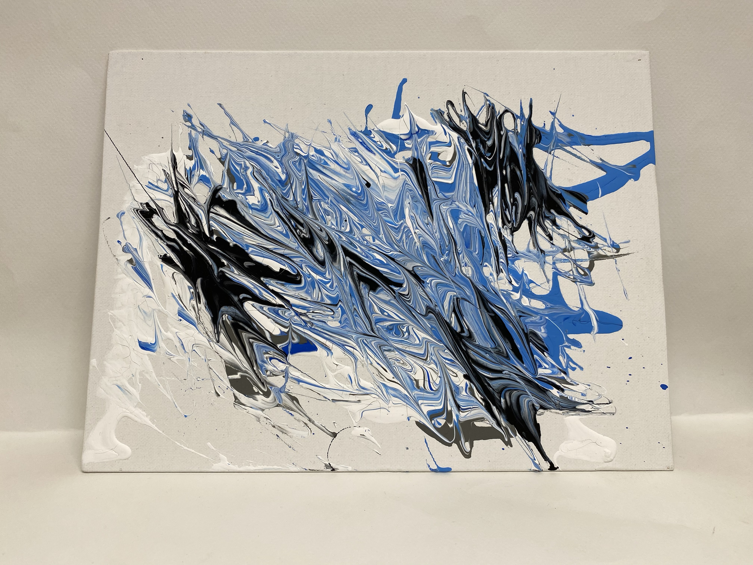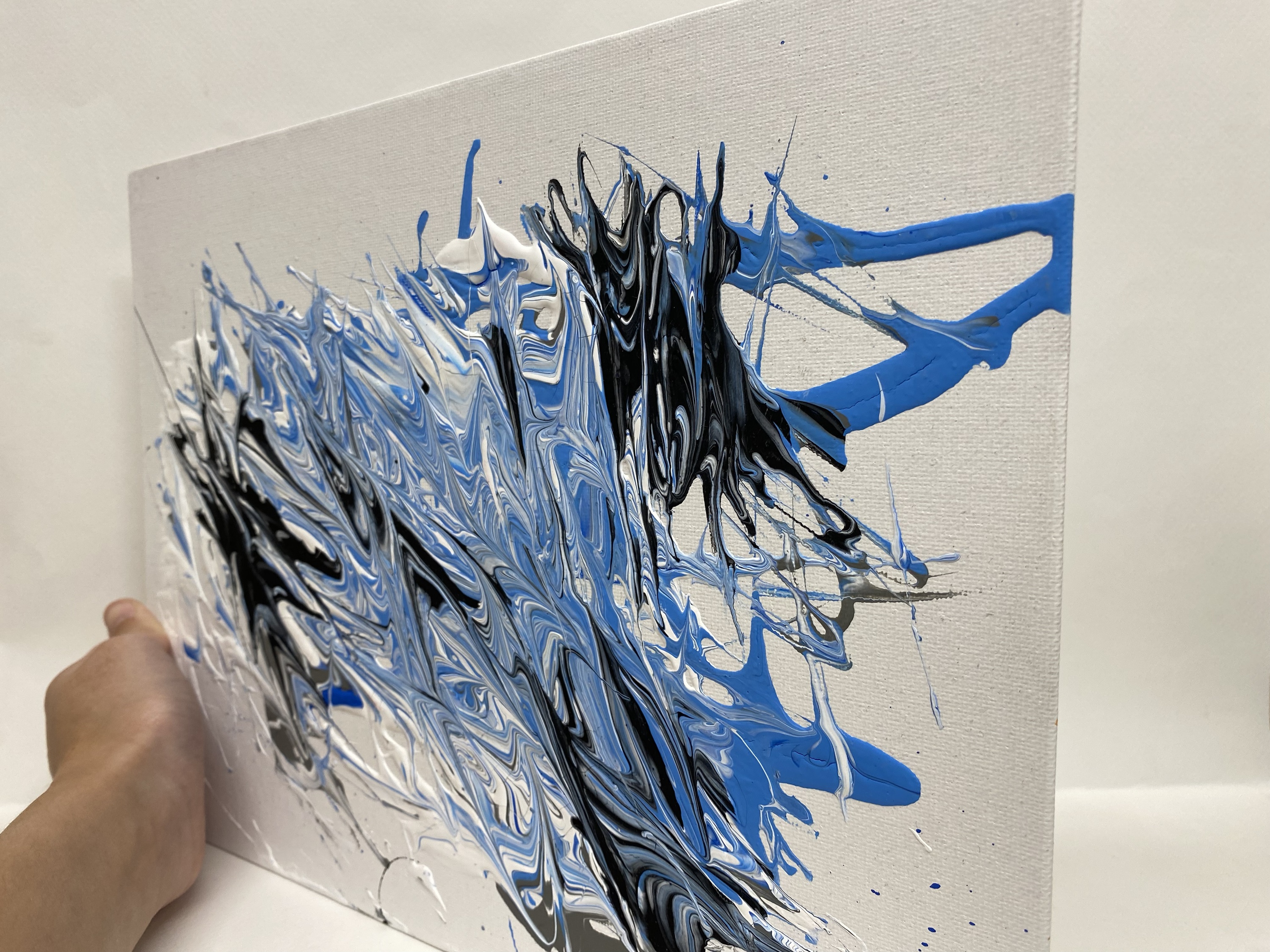 Enhance your space with this small, swirly, blue, black, and white painting. The dynamic mix of colors and swirling patterns creates a captivating focal point for any room. Measuring just the right size for a cozy nook or small wall, this unique artwork adds a touch of modern flair to your home decor.